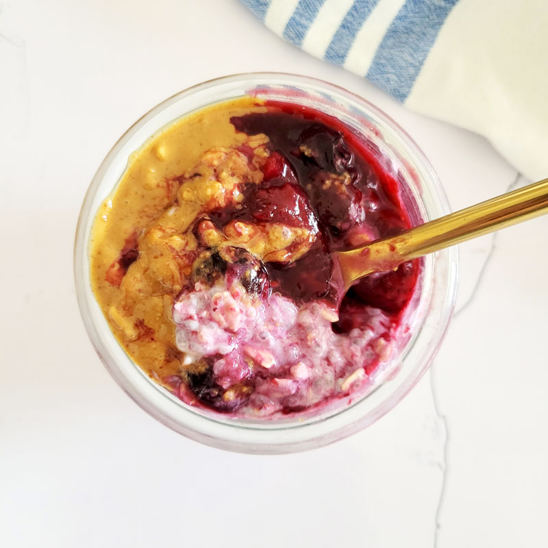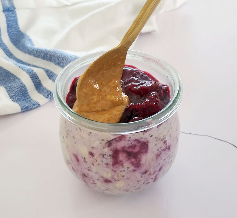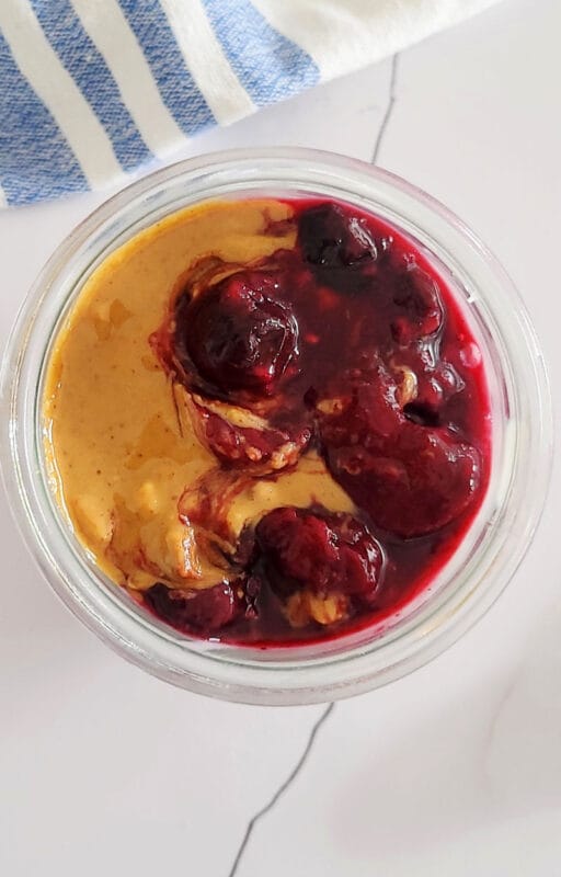 On busy mornings, I love opening the fridge and seeing the jars ready to go. There is something really comforting about knowing breakfast is already waiting, especially when the day starts early or everyone is moving at once. A spoonful of that berry layer mixed through the oats feels like a small treat before the day gets going. And let’s talk about that peanut butter that makes it taste just like PB & J.