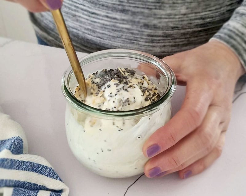 Step 1: Add the rolled oats, chia seeds, sea salt, vanilla, maple syrup, milk and Greek yogurt into a bowl or jar. Stir everything together until it looks smooth and evenly mixed.