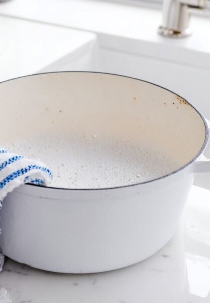 Enameled cast iron is very durable, but it doesn’t like sudden changes in temperature. For example, never rinse your pot with cold water when it’s hot from cooking. The shock can crack or damage the enamel. Let it cool down before washing, or fill it with warm water to loosen food gently.