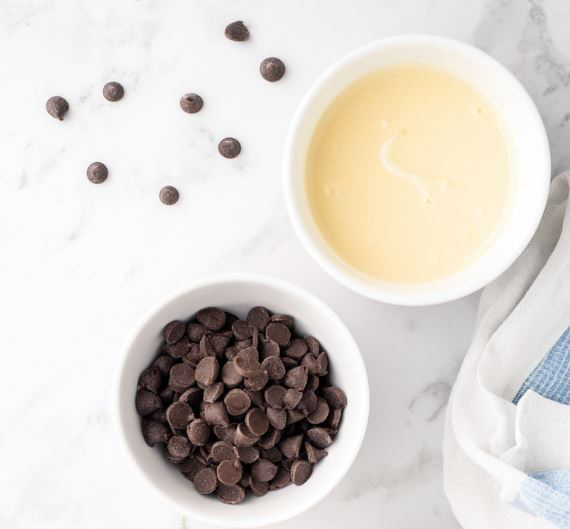In a large heat-safe bowl, combine the chocolate chips and the can of sweetened condensed milk. Melt them together using either the microwave (in 30-second intervals, stirring each time) or over a double boiler on the stove.